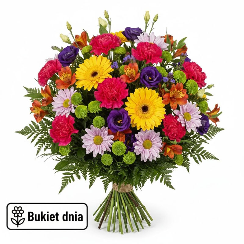 Bukiet Dnia to codziennie inna kompozycja kwiatowa tworzona z aktualnie dostępnych kwiatów. Każde zamówienie realizowane jest indywidualnie, a efekt końcowy pozostaje miłą niespodzianką. W bukiecie wykorzystywane są kwiaty sezonowe i całoroczne, co zapewnia świeżość i estetyczny wygląd przez cały rok. To idealny wybór na prezent bez konieczności wyboru konkretnego bukietu. Zamów bukiet z dostawą na terenie Bytomia, a my zadbamy o resztę.
