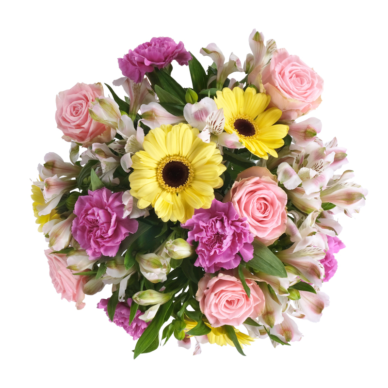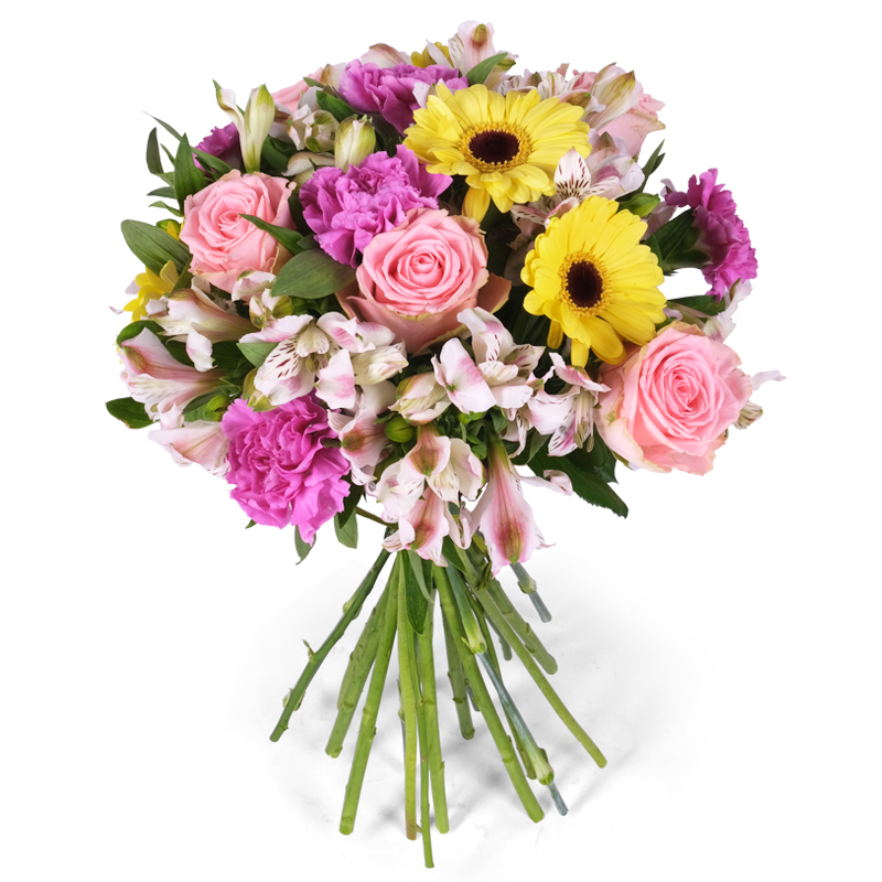 Zawsze świeże kwiaty Kiedy poszukujesz bukietu, który będzie wyrażać Twoje uczucia w sposób subtelny i pełen wdzięku, ta piękna kompozycja łącząca cztery różne gatunki kwiatów staje się oczywistym wyborem. Eleganckie róże w połączeniu z radosnymi gerberami, puszystymi goździkami i wdzięcznymi alstromeriami tworzą bukiet emanujący delikatnością. Anonimowo lub z podpisem, Twój wybór!