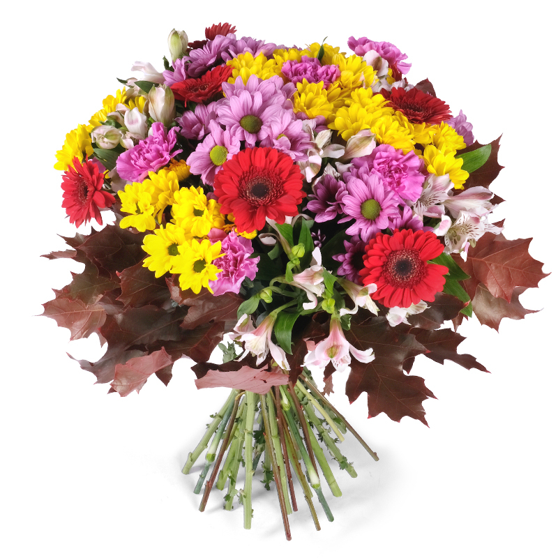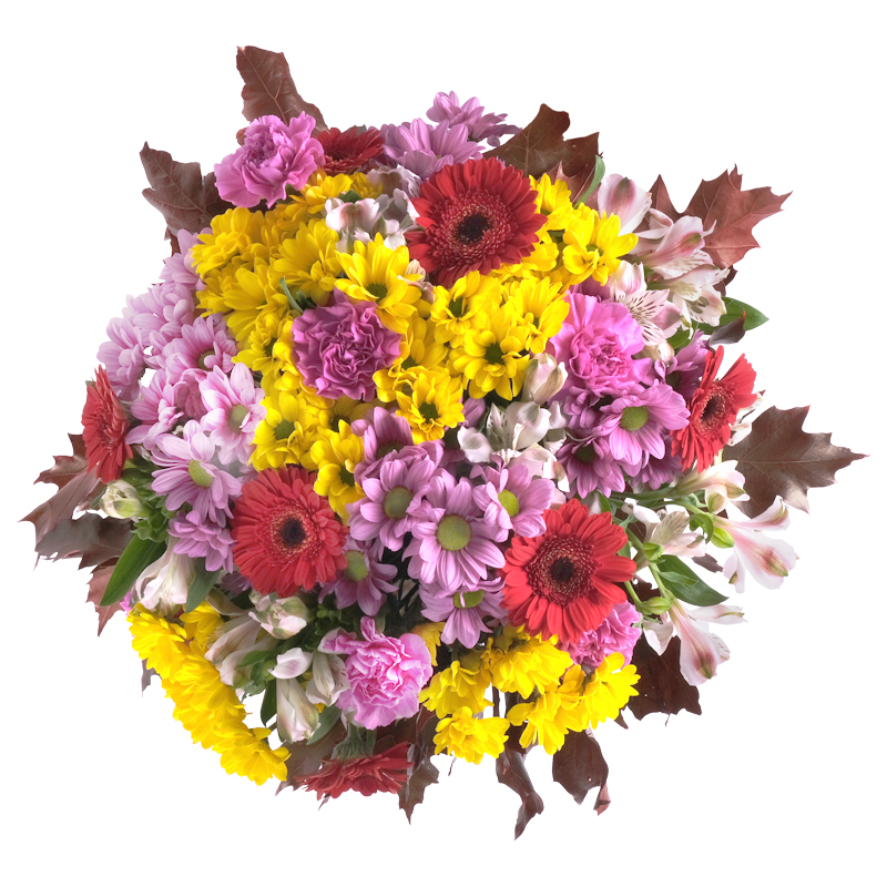 Różnorodność form - od dużych gerber przez gęste margerytki po wdzięczne alstromerie - pozwala wyrazić cały wachlarz uczuć. Taki bukiet mówi wszystko, co trudno ująć w słowa, ale jeśli chcesz dodać bilecik... Śmiało!
