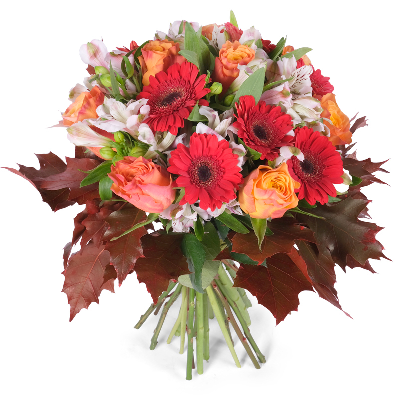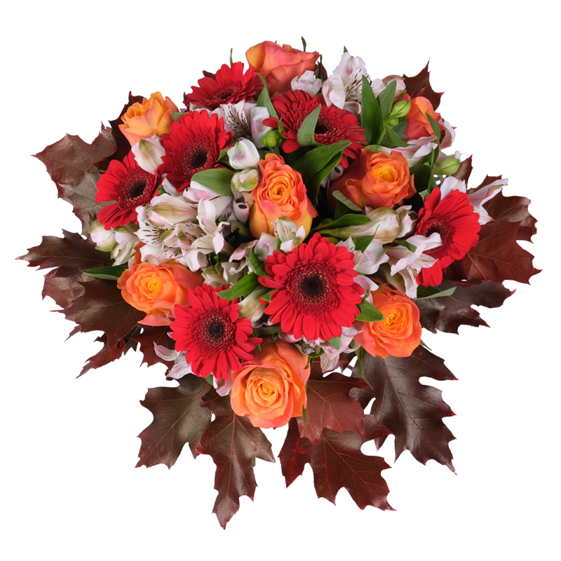 Ten bukiet to wyjątkowe połączenie gerber, róż i alstromerii. Całość dopełniają efektowne liście klonu, nadając kompozycji naturalnego uroku. Idealny na prezent, który wywoła uśmiech i ciepłe emocje. Pięknie ozdobi każde wnętrze. To bukiet, który zachwyca harmonią i lekkością. Dodaj liścik!