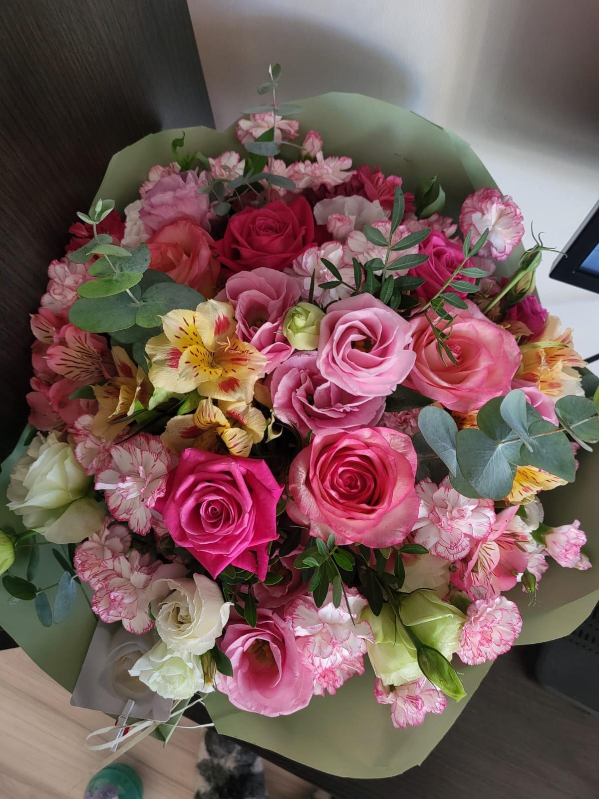 Bukiet „Siła kobiecości” to kwiatowa pochwała kobiecego piękna – pełen wdzięku zestaw z róż, goździków, eustom i alstromerii. Można dołączyć bilecik z dedykacją.